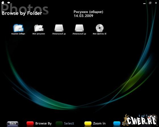 ТВ, DVD, видео, музыка, картинки, радио, новости (RSS сборщик), погода, экстразы, игры, справка, настройки. Поскольку пунктов меню много, все они сразу не видны на вращающейся орбите, но прокруткой можно добраться до любого.