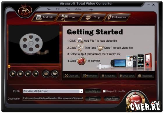 Aiseesoft Total Video Converter - программа предназначена для конвертации видео в форматы MP4, H.264, AVI, WMV, WMA, FLV, MKV, MPEG-1, MPEG-2, 3GP, 3GPP, MOV, RM, RMVB, M4A, AAC, WAV и т.д. Поддержка популярных мультимедиа проигрывателей, таких как: PSP, iPod, iPhone, PS3, Zune, iRiver, Walkman, Pocket PC и т.д. Функция извлечения аудиодорожек из входного файла и конвертации в форматы M4A, MP3, AC3, AAC, WMA, WAV, OGG. Функция для извлечения и конвертации определенной части входного файла. Настройка параметров аудио и видео для выходного файла. Слияние нескольких видеофайлов в один. Функция, позволяющая обрезать часть кадра. Режим «Zoom», позволяющий настроить размер и качество изображения.