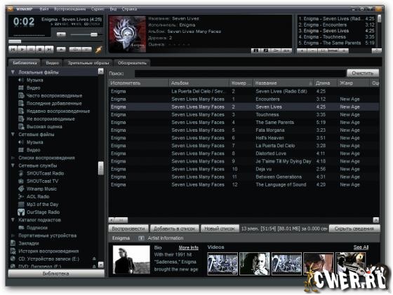 - Библиотека мультимедиа. Храните и проводите поиск ваших мультимедиа-файлов в одном месте. Возможность записи файлов из CD на компьютер и из компьютера на CD. Редактирование тэгов музыкальных файлов (исполнитель, композиция, альбом и др.). Доступ к интернет-радио и TV. Дополнительная информация (дискография, биография, обложки альбомов) о ваших любимых исполнителях и группах в плеере Winamp.