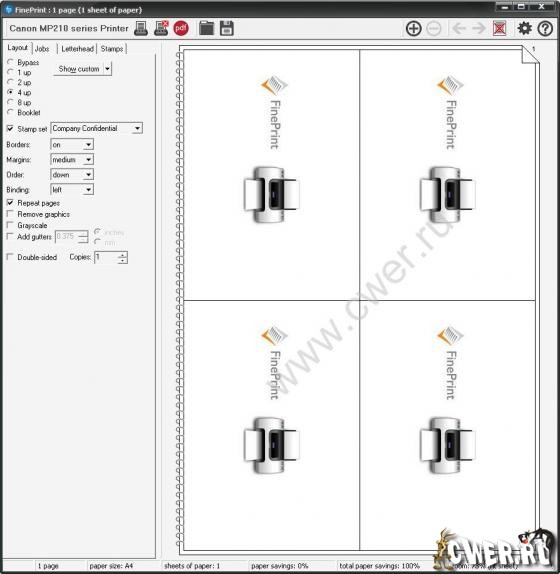 FinePrint - многофункциональный драйвер для принтеров, значительно расширяющий возможности любых принтеров при печати документов: предпросмотр, печать нескольких страниц на одном листе, распечатка брошюр, автовставка заголовка и "подвала", создание фирменных бланков, подложек, рамочек и многое другое. FinePrint работает со всеми моделями принтеров, являясь, по сути, многофункциональным универсальным драйвером принтера с удобной графической оболочкой для управления им. Еще одна полезная возможность - допустимость использования нескольких преднастроенных виртуальных принтеров. К примеру, один будет автоматически распечатывать брошюры, а другой - печатать текст на фирменном бланке. При использовании FinePrint значительно уменьшаются затраты на печать, в то же время общая работа принтера усиливается.