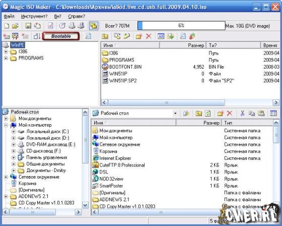 Magic ISO Maker - мощный инструмент для создания и редактирования образов CD/DVD дисков. С помощью MagicISO вы можете создавать и редактировать образы дисков, извлекать отдельные файлы из образов, записывать файлы образов на CD/DVD, создавать загрузочные диски. Одним из достоинств программы является большой список поддерживаемых форматов – она работает с ISO, BIN, NRG, CRF, BWI, IMG и др.