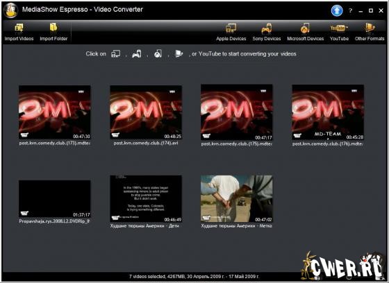 MediaShow Espresso - это новая программа от компании CyberLink для конвертации всех ваших видео файлов в форматы для портативных устройств и онлайн видео. Таким образом вы сможете преобразовать все ваши любимые фильмы и видеоролики в форматы для iPhone, PSP, Xbox, YouTube и других устройств и онлайн видео-сервисов. Для этого вам достаточно выбрать предпочтительный медиа плеер или способ для преобразования и MediaShow Espresso сделает остальную работу сама без вашего вмешательства. В дополнении, с помощью этой программы вы сохраните много драгоценного времени благодаря поддержке Intel Core i7, NVIDIA CUDA, and ATI Stream CPU/GPU технологий. Программа проделает конвертацию быстро, качественно и эффективно. А интуитивный интерфейс программы расположит к себе, наверное, любого пользователя, даже начинающего.