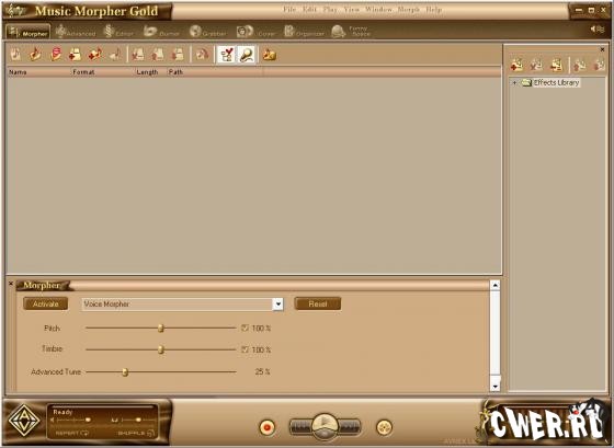 Кроме того, AV Music Morpher Gold включает программу записи MP3 и устройство автоматической смены дисков. В отличие от других MP3 проигрывателей, таких как Winamp, MusicMatch, RealPlayer или Windows Media Player, Music Morpher Gold может проигрывать и изменять музыку в режиме реального времени. Смеситель эффектов и библиотека эффектов разработаны для ваших разнообразных вкусов. Этот комплект инструментов также работает как MP3 конвертер, очень полезный в преобразовании MP3 в WAV, WMA или в любой из 10 поддерживаемых форматов музыки. Music Morpher Gold an easy CD creator поставляется с: CD ripper для записи звуковых дорожек на жесткий диск, устройством записи для записи аудио компакт-диска, компакт-диск с данными и DVD данными, дизайнером обложек для проектирования обложек для компакт-дисков и DVD. Мультиформатный аудиопроигрыватель поддерживает форматы MP3, MP2, WMA, WAV, APE, OGG, AU, IRC. AV Music Morpher Gold - лучший выбор для запуска дорожек в различных форматах, особенно музыки, загруженной из различных file sharing систем, таких как Kazaa, iMesh, eMusic, Napster, and Music Net. Music Morpher Gold совместим с караоке. Music Morpher Gold идеально подходит для оперативной трансформации музыки, смешивания музыки, создания заказного CD, караоке CD, звуковой дорожки и аудио клипов.