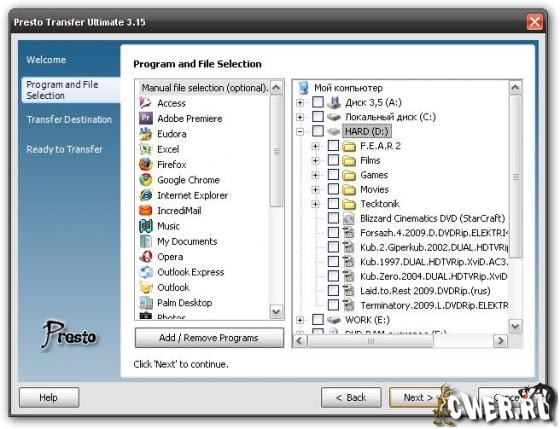 Presto Transfer - приложение для автоматизации передачи ваших данных с одного компьютера на другой. Удобный в использовании интерфейс программы создает самораспаковывающийся архив ваших данных, для восстановления которых нужно просто запустить архив на компьютере получателя. Архив можно автоматически записать на CD/DVD, на MP3-плеер через USB, на съемные носители или переслать на удаленный FTP сервер. Вы можете выбрать вручную папки, диски или файлы для копирования или же быстро выбрать и передать данные из множества программ, включая такие программы, как Word, Access, Excel, Photoshop, PowerPoint, Opera, Firefox, Internet Explorer, Outlook, Skype и другие.