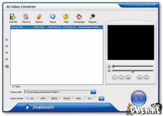 Zealot Video Workshop - это конвертер видео файлов различных форматов, нарезка и соединение видео файлов, создание и запись видео CD, DVD. 4 утилиты в одном "флаконе": All Video Converter, All Video Joiner, All Video Splitter и All Video to VCD SVCD DVD Creator & Burner.