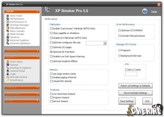 XP Smoker содержит опцию Game Boost, позволяющую увеличивать производительности системы при использовании компьютерных игр. Модуль Manage CPU Priority, позволяющий задать максимальный приоритет всем запускаемым компьютерным играм или всем системным процессам. Еще одна немаловажная особенность программы — модуль Boot Boost, позволяющий ускорить загрузку Windows и стартующих вместе с ней программ.