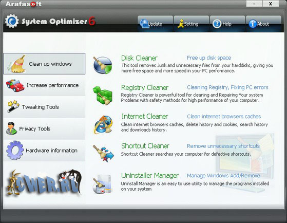 Arafasoft System Optimizer - пакет полезных утилит, включающий в себя средства для устранения ошибок в реестре, жесткого диска, а также для его дефрагментации и очистки, инструменты поиска и удаления временных файлов и прочего виртуального мусора, резервного копирования важных системных файлов и быстрого их восстановления в случае какого-либо сбоя.