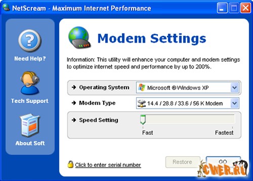 Программа которая поможет вам значительно увеличить скорость интернет-соединения. NetScream способна добиться полной отдачи от модема путем тонкой настройки его программных параметров. Программа имеет интуитивно понятный интерфейс, оптимизирует настройки для Dial-up, DSL, ADSL, ISDN, спутниковых и кабельных модемов, предотвращает разрывы соединения и повышает скорость скачивания/закачивания файлов.