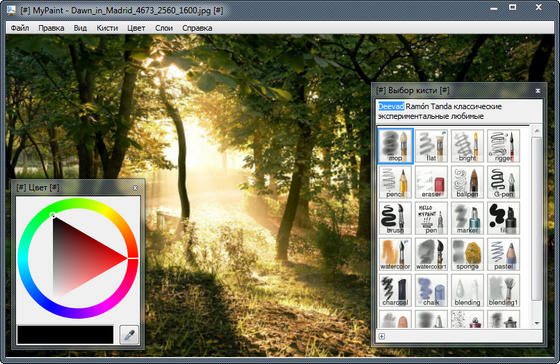 MyPaint - специализированная программа для рисования, заточенная под использование графических планшетов. Обладает очень мощным движком кистей, благодаря чему все инструменты, а они в программе только рисующие, реализованы как специализированные кисти. В программе бесконечный холст, есть отмена действий и простая реализация слоёв.