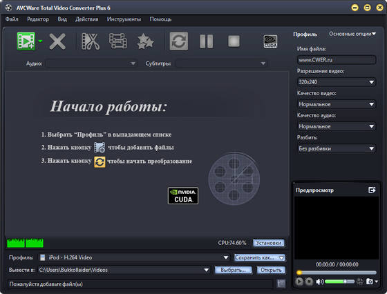 AVCWare Total Video Converter Plus - мощный и удобный конвертер видео с поддержкой HD форматов. Total Video Converter позволяет преобразовывать HD видео в видео стандартного разрешения ( поддерживаются форматы AVI, MPEG, WMV, DivX, MP4, H.264/AVC, MKV , RM, MOV, XviD, 3GP и т.д.). Программой поддерживается конвертация видео в форматы для мобильных устройств (IPod, iPhone, iPhone 3G, Apple TV, PSP), современных игровых приставок (PS3, Xbox, Wii), смартфонов, MP3/MP4 плееров (Archos, Creative Zen, IRiver), карманных ПК. Кроме того, в программе имеются функции извлечения сегмента из видео файла, настроики видео эффектов, изображения и создание водяных знаков.