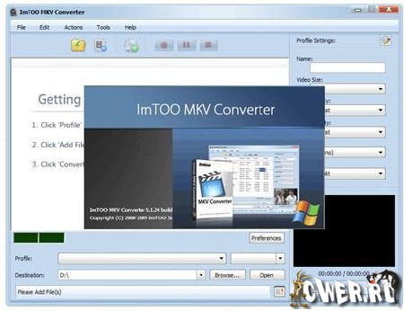 ImTOO MKV Converter - конвертер MKV файлов в другие видео форматы, поддержка AVI, WMV, DivX, MP4, H.264/AVC, XviD, MOV, MCE AVI и других форматов, извлечение аудио в MP3, WAV, WMA, AAC, M4A и другие аудио форматы, поддержка пакетного режима работы, предварительный просмотр результата, выбор и настройка кодеков, выбор и настройка параметров конвертирования, поддержка iPod, PSP, Apple TV, PS3, Xbox и других мобильных устройств.