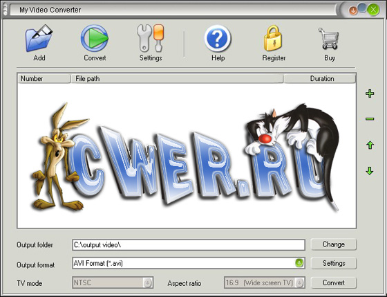 My Video Converter - видео конвертер, позволяющий преобразовывать видео файлы между форматами: AVI/DIVX/XVID/DIV, MPEG/MPG/DAT, WMV/ASF/ASX, RM/RMVB, MOV/QT, 3GP/3G2, MP4/M4V, FLV. Умеет работать с видео файлами больших размеров (более 2GB) и обрабатывать группы файлов.