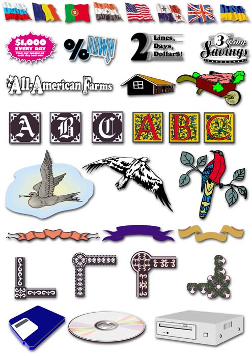Темы клипартов: Advertising, Agriculture, Alphabets - General, Alphabets - Specialized, Americana, Anatomy, Animals, Antique Style, Architecture & Landmarks, Arrows, Art & Design, Backgrounds, Beauty, Borders, Brush Strokes, Business & Office, Buttons, Calendar, Cartoons, Clothing & Accessories, Computers, Construction, Crests & Emblems, Education & Schools, Electrical, Electronics, Energy, Engineering, Entertainment, Fantasy & Medieval, Fitness, Flags, Food & Drink, Furniture, Gardening, Government, Graphs & Charts, Hands, Health & Medical, Holidays, Household, Interior, International.