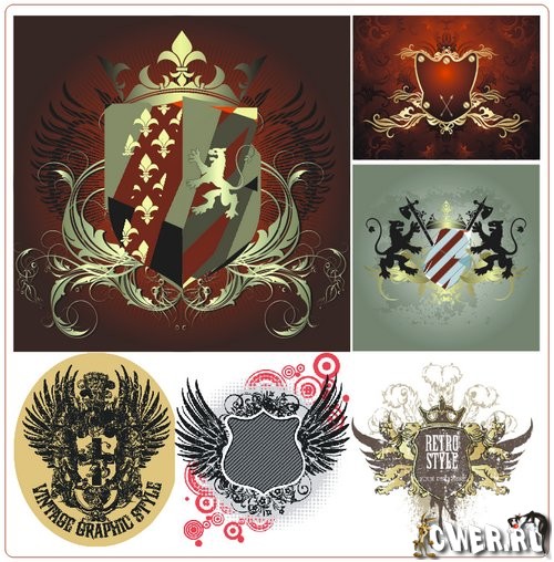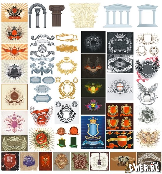Сборник векторных изображений геральдических щитов, рамок для текста и других дизайнерских элементов в AI & EPS форматах, 65 файлов
