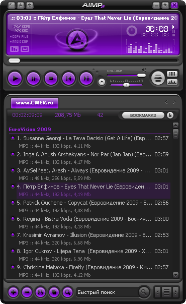 AIMP - это многофункциональный аудио центр. Благодаря встроенным утилитам, вы легко сможете перекодировать музыку из одного формата в другой, записать звук с микрофона или другого звукового устройства, отредактировать тэги музыкальных файлов, а так же группой переименовать или отсортировать их. AIMP2 базируется на известном аудио движке BASS - вы с легкостью можете подключить плагины от этой библиотеки к AIMP.AIMP - это отличный аудио плеер с поддержкой: скинов, многих музыкальных форматов и плюс, имеющий встроенные утилиты для работы со звуком.