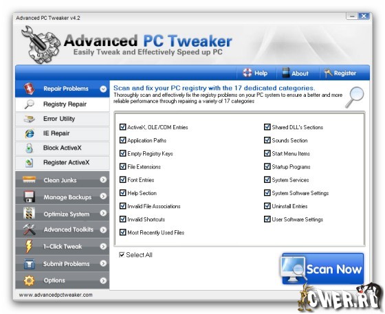 Advanced PC Tweaker - программа для оптимизации работы и изменения многих параметров операционных систем Windows. Как и многие подобные программы, позволяет чистить систему от ненужных файлов и прочего мусора, засоряющего жесткий диск вашего компьютера. Также программа выполняет множество функций по оптимизации вашей системы - устраняет ошибки системного реестра, чистит жесткий диск от мусора, позволяет управлять резервными копированием, на случай крах системы, и другие современные возможности, такие как управление автозапуском программ, удаление нежелательных приложений, стирание файлов с жесткого диска, без дальнейшей возможности их восстановления и многое другое. Интерфейс программы имеет приятный пользовательский интерфейс, очень похожий на интерфейс известного продукта от немецкого разработчика TuneUp Utilities.
