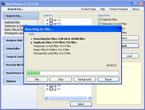 Need3space - это исчерпывающий набор инструментов для освобождения места на переполненных носителях. Позволяет освобождать свободную площадь за счет поиска и удаления одинаковых двойных файлов (по CRC32), временных и удаленных файлов, устаревших и редко используемых, пустых папок и файлов нулевого размера. С помощью анализатора диска, всего одним щелчком, поможет найти дополнительно огромную массу резервов для освобождения места. Выявит, какой из файлов самый большой по размерам, и какие группы файлов - кино, музыка, фотографии, программы - мертвым грузом лежат на оперативном диске, отчего появится желание перенести их на другие носители для длительного ответственного хранения. Присутствует и интегрированный деинсталлятор, который выведет для вас в окне данные о размерах, установленных в вашей системе приложениях, системных компонентах, сервисных паках и сломанных деинсталляторах, что даст еще источник расширения столь необходимого рабочего пространства. Присутствует продвинутый эксплорер корзины, имеет настройки масок исключения, имеет поисковый движок с малым потреблением ресурсов и контекстное меню для удобства управления с установкой приоритета выполняемых задач.