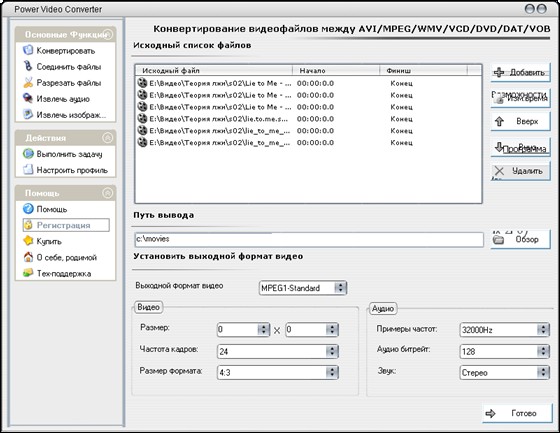 Утилита Power Video Converter предназначена для преобразования видеофайлов из одного формата в другой. Кроме этого, Power Video Converter позволяет производить резку и склейку файлов. Программа поддерживает форматы AVI, MPEG1, MPEG2, VCD, DVD, ASF и WMV.