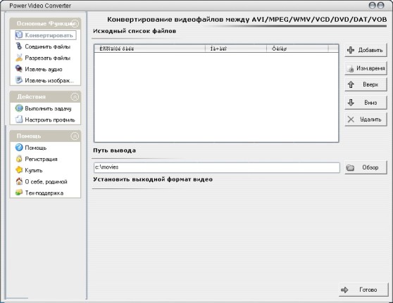 Power Video Converter - конвертер между популярными видео форматами. Имеется поддержка AVI, DivX, XviD, MPEG-4, MPEG1, MPEG2, VCD, SVCD, DVD, WMV, ASF, DAT, VOB форматов, пакетный режим конвертирования, высочайшая скорость конвертирования, поддержка PAL, NTSC видео, нарезка видео на фрагменты (ролики) по выбранному размеру или по временным позициям в встроенном проигрывателе, соединение фрагментов в один большой видео файл, извлечение аудио из видео и сохранение в MP3, WAV, WMA форматы, извлечение фрейма или разложение видео на последовательность BMP картинок, создание или загрузка WMV профиля, простой и удобный интерфейс, выбор и настройка кодеков, настройка параметров конвертирования, низкие системные и аппаратные требования.