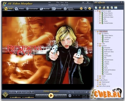 AV Video Morpher 3.0.13 – новая версия видеоредактора. AV Video Morpher позволяет создавать пользователям собственные фильмы, добавлять голос и эффекты к уже существующим и записывать видео-DVD. Помимо этого с помощью программы можно изменять или удалять голос актеров в редактируемых фильмах, создавать профессиональные черно-белые фильмы и др. Кроме того AV Video Morpher можно использовать в качестве проигрывателя и конвертера видео. В новой версии появилась поддержка Surround Sound, новых аудио- и видеоэффектов, а также произведено улучшение некоторых функций озвучивания.