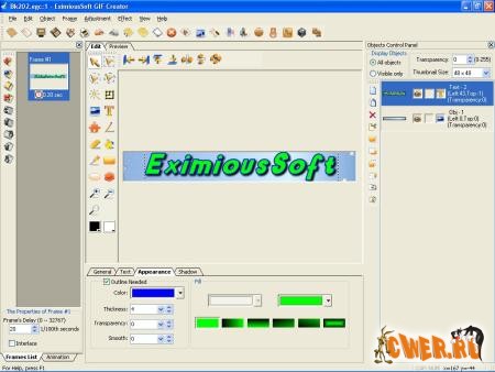 EximiousSoft GIF Creator является легким и мощным средством для создания высокого качества анимированных GIF. В программе 40+ эффектов , чтобы строить впечатляющие анимации или баннеры. Добавляя тени или схемы, Вы можете сделать более эффективными анимации. Автоматическая оптимизация создает минимальные размеры файлов GIF и сохраняет все оригинальное изображение и качество. Все инструментальные средства могут произвести самые гладкие тексты, символы, и геометрические формы, побитовые отображения.