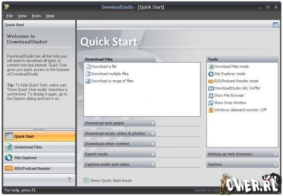 DownloadStudio – это простой и вто же время мощный в использовании менеджер с режимом быстрого запуска и мастером закачки. Расширенная помощь и руководства объяснят вам, как закачивать различные типы содержимого с веб сайта. Поддерживает все популярные Интернет протоколы - HTTP, HTTPS, FTP, MMS, RTSP, RSS, RDF и ATOM.