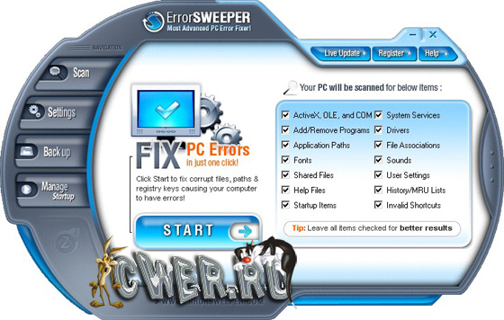Одним щелчком мыши вы запустите PC Error Sweeper, который восстановит ваш реестр, увеличит скорость, улучшит показатели и стабильность вашего ПК. PC Error Sweeper может просканировать и починить ваш реестр за считанные минуты, восстанавливая эффективность и скорость вашего компьютера, позволяя вам работать без неисправностей в вашем ПК.