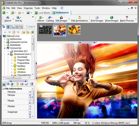 CodedColor PhotoStudio Pro - профессиональная версия фото просмотрщика и редактора, предназначенного для организации, редактирования, сравнения, корректирования, сортирования и печати цифровых изображений. Также программа позволяет изменять размер изображений, накладывать водяные знаки, аннотировать изображения, редактировать EXIF и IPTC данные цифровых фотографий и многое другое. Вы сможете переименовывать несколько изображений, удалять царапины, создавать панорамные фотографии, конвертировать RAW фотографии, отправлять изображения через Skype, накладывать водяные знаки на фотографии, корректировать цвета, запускать слайдшоу, конвертировать и корректировать JPEG изображения в пакетном режиме, открывать картинки и папки изображений из Проводника, генерировать веб-альбомы на HTML и сжимать JPG файлы в размерах. Все операции, проводимые в данной программе обрабатываются в интерфейсе, который поддерживает вкладки.
