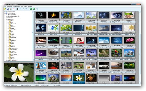 Программа для просмотра, редактирования и печати изображений. Поддерживает основные графические форматы (bmp, jpg, gif, png, tga, tiff, pcx, ico и т.д.). Доступна навигация по каталогам, просмотр изображений в текущем каталоге и окне предпросмотра. В настройках можно указать какие файлы необходимо открывать программой при нажатии на них. В окне просмотра (переход к которому осуществляется по двойному клику) можно редактировать изображение, изменять размер, вращать, менять увеличение, регулировать яркость, контраст, насыщенность. Также доступен режим слайдшоу при котором изображения буду меняться поочередно с и нтервалом, установленным в настройках.
