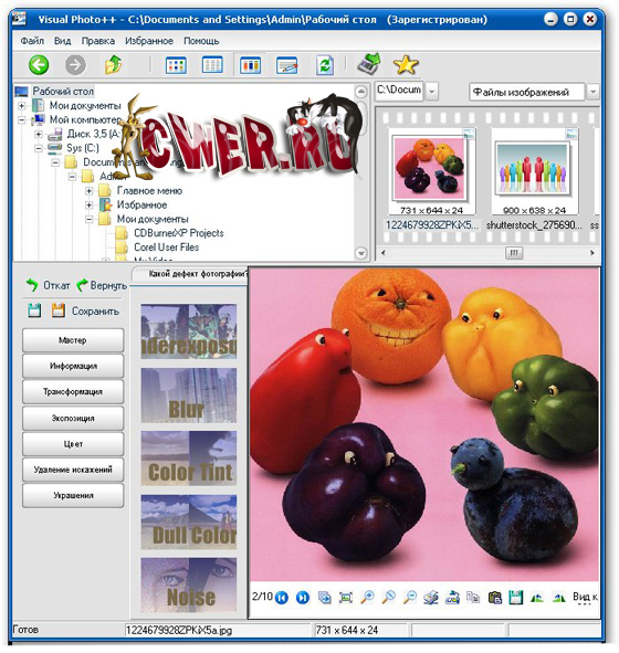 Visual Photo++ - не только приложение для получения, организации и просмотра, но также и редактор, позволяющий, изменить и отрегулировать многочисленные параметры изображения (яркость, контрастность, гамма, баланс, резкость, цифровой шум и многие другие), а так же добавить к изображению различные декоративные элементы (текст, рамки, эффекты искажения формы и цвета).