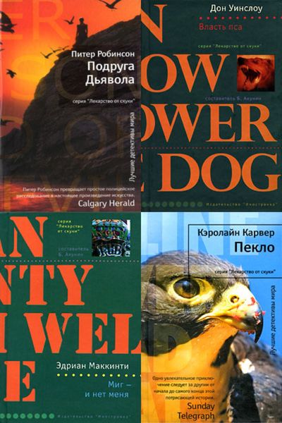 Книжная серия "Лекарство от скуки" издательства «Иностранка» была основана в 2001 г. Идея серии была предложена признанным российским мастером детективного жанра, знатоком мировой индустрии остросюжетной беллетристики Борисом Акуниным. Вот уже много лет Борис Акунин – создатель известнейших российских литературных проектов детективного направления – остается составителем и «патроном» этого собрания лучших образцов мирового детектива. Под девизом «серьезный подход к несерьезному жанру» издательство «Иностранка» предлагает ценителям действительно качественного и по-настоящему увлекательного чтения, ни за что не желающим опускаться до макулатурного чтива, пополнить свои библиотеки коллекцией высококлассных историй, созданных ведущими «детективщиками» мира.
