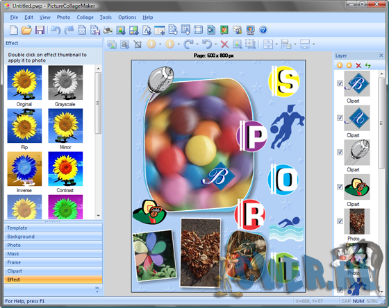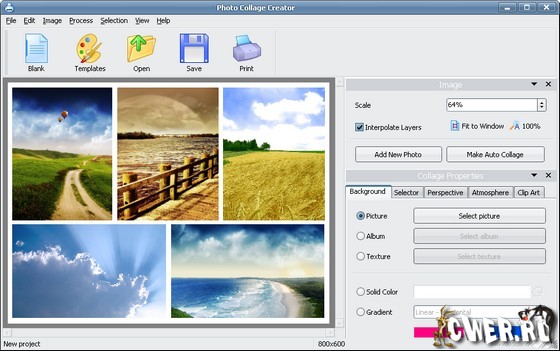 Picture Collage Maker - простая в использовании программа для создания коллажей из ваших фотографий. Простой интерфейс программы и множество шаблонов позволят легко создавать разнообразные фотоколлажи (календари, поздравительные открытки, пригласительные билеты, постеры и т.д.) даже неопытным пользователям. Создание коллажей - это расслабляющее время-провождение, помогающее превращать собранные фотографии в драгоценные воспоминания. Это самый легкий способ создания коллажей с применением вращений, изменения размеров, положений, обрамлений, маскировки, слияния и применением различных эффектов для каждой картинки по-отдельности. Результат может быть сохранен в форматах JPG, BMP, TIFF, GIF, WMF, TGA, PNG или установлен в качестве фонового рисунка для рабочего стола.