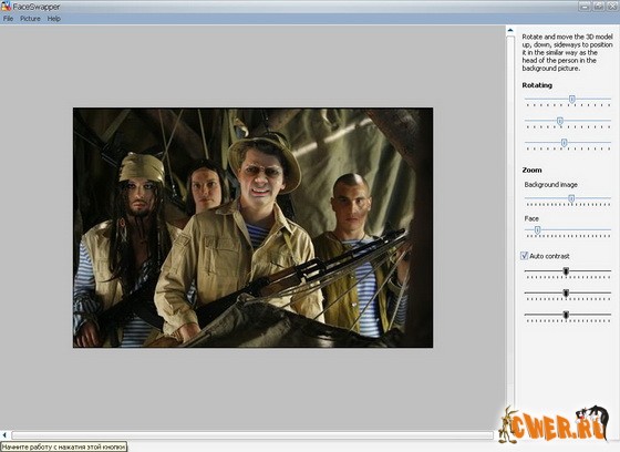 Программа FaceSwapper позволяет за пару минут создать оригинальный коллаж, художественную композицию или прикольную фотожабу. В программе используется новейший алгоритм распознавания лица и его автоматической замены без точного выделения объекта и обработки границ. Выделение, вставка и подгонка лица под фоновое изображение по размеру, положению и цвету происходит в трехмерном пространстве редактора, что позволяет достичь цельности нового изображения. Теперь для создания профессионального коллажа вам не нужно приобретать дорогостоящий графический редактор или тратить время на изучение руководства к приложению для 3D моделирования.