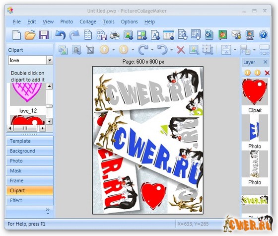Photo Collage Maker - удобная программа для создания оригинальных композиций, состоящих из фона и нескольких фотографий. Создать красивый коллаж в программе можно быстро и просто: достаточно выбрать фоновое изображение из каталога, добавить пару-тройку собственных фотографий и поэкспериментировать с различными эффектами. Программа позволяет также добавлять надписи и украшения. Получившийся коллаж можно просмотреть на полный экран, сохранить или распечатать. Предусмотрена функция быстрого экспорта коллажей в любой из популярных графических форматов. С Photo Collage Maker вы сможете создавать удивительные композиции, не затрачивая на это много времени и сил. Интуитивно-понятный интерфейс, обилие графических материалов в комплекте, а также большое число дополнительных функций помогут вам создать действительно яркий и красивый коллаж.
