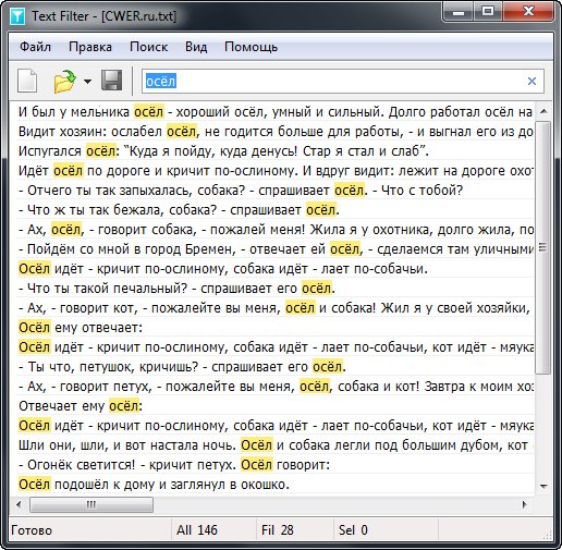 Text Filter - бесплатное приложение, которое предназначено для чтение текстовых документов, а также позволяющее осуществлять поиск в файле указанных пользователем терминов или фраз. Текстовые строки сразу же фильтруются при вводе поисковой фразы, а соответствующие слова выделяются контрастным цветом. Присутствует несколько режимов фильтрации. Результаты поиска могут быть скопированы в буфер обмена.