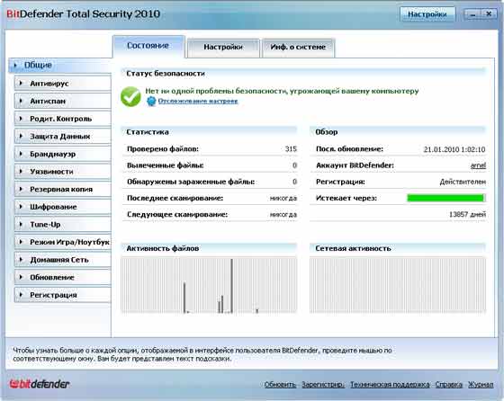 BitDefender Total Security - программный пакет для комплексной защиты компьютера. Включает в себя антивирус с регулярной проверкой системы, почты и IM-сообщений, проактивной защитой и поддержкой обнаружения вирусов и руткитов, а также firewall, антишпион и модуль родительского контроля.