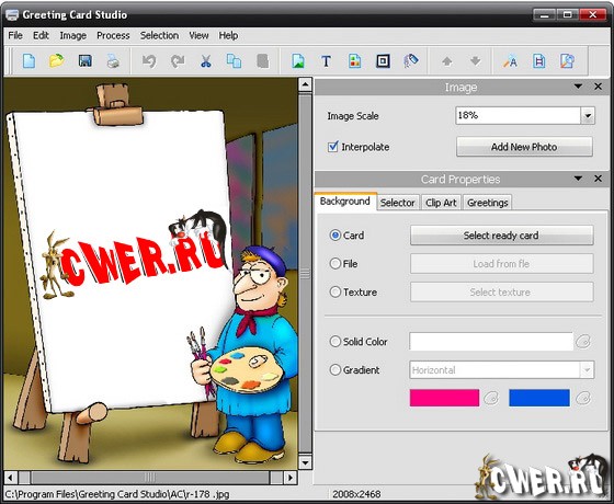 Greeting Card Studio - легкая в использовании программа для быстрого создания высококачественных поздравительных открыток. С помощью этой программы вы сможете создавать открытки, используя ваши собственные изображения, фон и текст. Программа содержит в себе готовые профессиональные шаблоны, предназначенные для быстрого создания открытки. Вам нужно всего-лишь выбрать бумагу, нужный дизайн, открыть понравившийся шаблон, отредактировать открытку и распечатать ее на принтере. Также вы сможете создать собственный уникальный дизайн и наложить на картинки эффекты, рамки, границы, сделать фон и наложить различные изображения на вашу открытку. При этом, вам дается возможность масштабирования и переворачивания фотографий как вы пожелаете. Готовый результат вы сможете распечатать на принтере или сохранить в один из графических форматов.