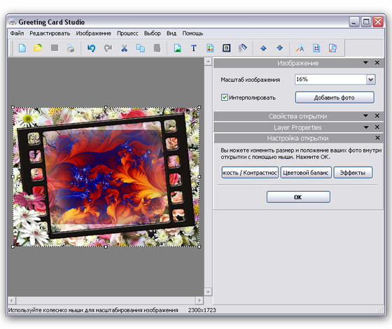 Greeting Card Studio - легкая в использовании программа для быстрого создания высококачественных поздравительных открыток. С помощью этой программы вы сможете создавать открытки, используя ваши собственные изображения, фон и текст. Программа содержит в себе готовые профессиональные шаблоны, предназначенные для быстрого создания открытки.