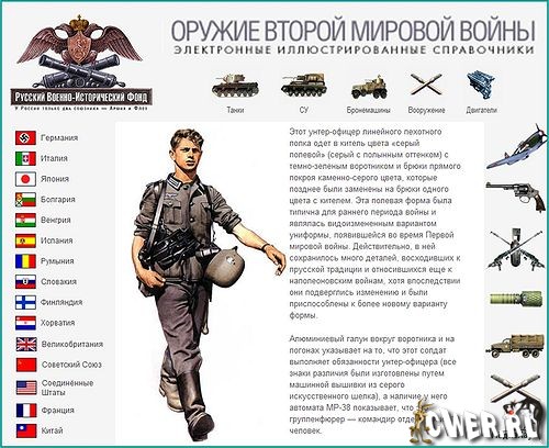 В этом электронном справочнике вы найдёте сведения о всех видах и типах вооружений, используемых воюющими сторонами в период Второй мировой войны. Это не только произведённые во время войны, но и довоенные модели (в том числе и гражданской техники, реквизированной ВС различных стран из-за нехватки вооружения). Критерий, по которому представлены образцы оружия и военной техники: участие в боевых действиях.