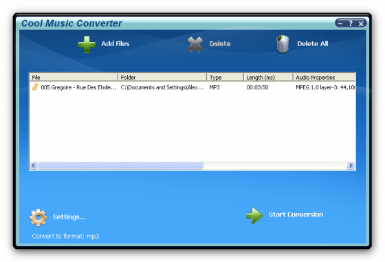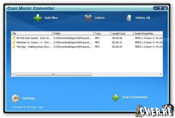 Cool Music Converter - конвертер, который позволяет конвертировать аудио файлы между WAV, OGG Vorbis, MP3, MP2, Microsoft ADPCM, WMA, VOX, AAC, M4A, AMR и другими форматами.