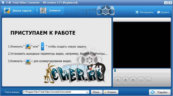 E.M. Total Video Converter HD - это как раз именно тот конвертер, который умеет делать с файлами почти всё. E.M. Total Video Converter это программа не только для конвертирования почти всех видов видео и музыкальных файлов в популярные форматы, включая мобильные, но и CD-риппинг, конструктор фото слайд-шоу с 300-ми различными фантазийными переходными эффектами, сборка и прожиг дисков отвечающих DVD/SVCD/VCD стандартам, извлечение звука из видео файлов с прямой конвертацией в mp3, ac3, ogg, wav, aac, объединение звука и видео в единый файл с синхронизацией, снифер-загрузчик флэш-видео Flv, и многое другое, снабженное собственным высокоскоростным встроенным "движком" и наделенное качественным проигрывателем.