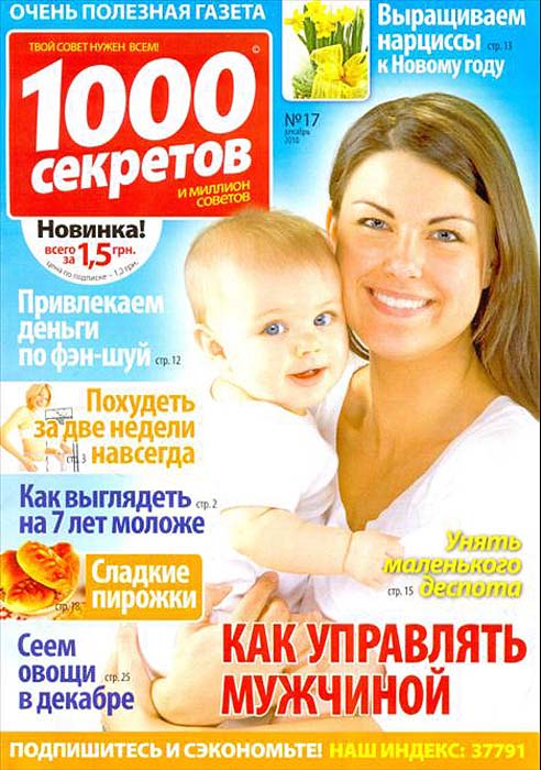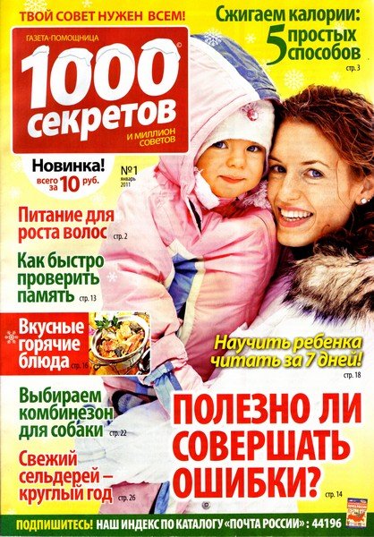 "1000 секретов" - народный журнал, который будет полезен каждому без исключения. Он содержит по несколько полос из каждой области человеческой жизни: воспитание детей, кулинария, здоровье, строительство и ремонт, сад и огород, умелые руки, дизайн, физическое развитие, психологические и юридические консультации.