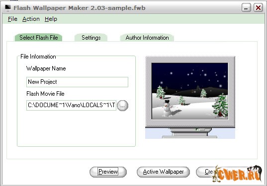 Flash Wallpaper Maker небольшая программа, которая позволяет делать обои для рабочего стола из Macromedia swf-файлов(поддерживает форматы Flash 4, Flash 5 и Flash 6/MX, Flash MX 2004). Есть предпросмотр.. В программе можно создавать инсталляционные пакеты с обоями.
