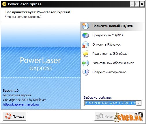 PowerLaser Express представляет собой программу для записи CD/DVD дисков. Программа имеет компактный размер, не требует установки и не изменяет системный реестр. Все это делает возможным её работу со сменных носителей.