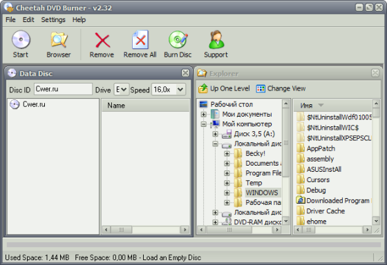Cheetah DVD Burner программа для прожига DVD+R/W, DVD+R, DVD-R, DVD-R/W, и DVD-RAM, а так же CDR и CD-R/W в формате ISO. Кроме того, программка поддерживает не только Data запись, но и ещё и аудио.