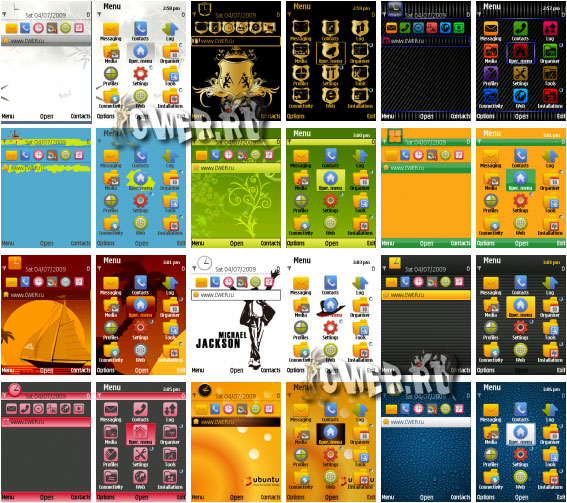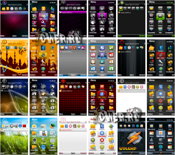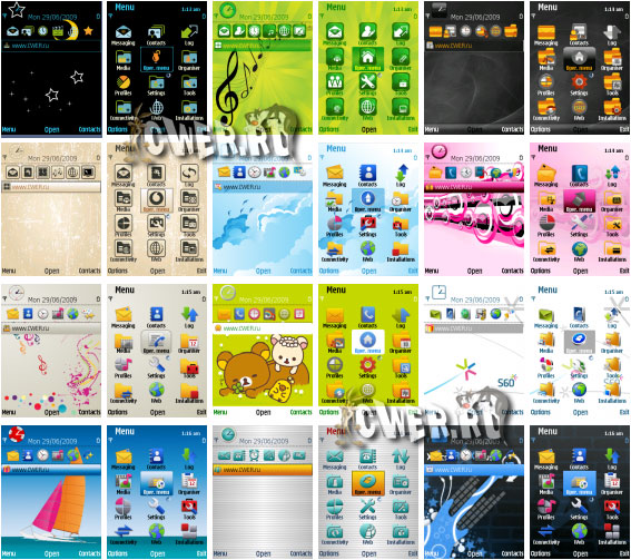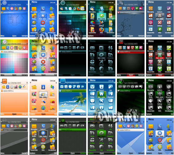 Темы для смартфонов Nokia под управлением Symbian OS 9.х: Nokia 3250, 5500 Sport, 5700, 6110 Navigator, 6120 c, 6121, 6220 classic, 6290, E50, E51, E60, E61, E61i, E62, E65, E70, E90, N71, N73, N75, N76, N77, N78, N79, N80, N81, N81 8GB, N82, N91, N92, N93, N93i, N95, N95 8GB и др. cwer.ws