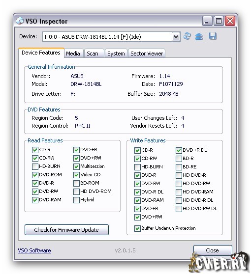 VSO Inspector - программа для работы с CD/DVD приводами. С её помощью можно получить подробную информацию об установленных в системе читающих и пишущих приводах. Программа показывает, какие типы дисков читает и записывает привод, какая на нем установлена прошивка; если это DVD привод, то диски какого региона он может воспроизводить. Кроме того, программа может получать разного рода информацию о носителе, находящемся в приводе (производитель диска, его размер, поддерживаемая скорость записи, в какой программе записывали тот или иной диск). Утилита умеет сканировать диски на ошибки и проверять читаемость файлов.