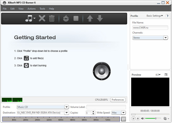 Xilisoft MP3 CD Burner - это профессиональная и мощная программа для записи MP3 CD, которая поможет вам записывать CD, музыкальные CD, MP3 CD, записывать WMA CD из файлов почти всех популярных аудио и видео форматов, включая MPEG, WMV, ASF, AVI, MOV, 3GP, RM, MP4, MP3, MP2, WMA, WAV, AU, M4A, RA, OGG, AAC, AC3. С MP3 CD вы сможете также редактировать некоторые информационные параметры CD, такие как исполнитель, альбом, название, интервал между песнями.