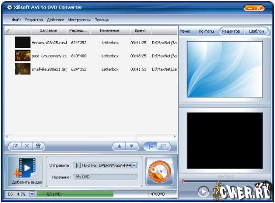 Xilisoft AVI to DVD Converter – это быстрая и простая в использовании программа для создания DVD, которая может конвертировать AVI, MPEG, DivX в DVD и записывать AVI на DVD диск, воспроизводимый на домашнем плеере DVD. Она позволяет вам определить систему NTSC или PAL, настроить 4:3 или 16:9 видео, и записать или весь DVD диск или ISO файл. Программа поддерживает DVD-R, DVD+R, DVD-RW и DVD+RW, настраивается полосу пропускания (bitrate) и частота кадров Frame Rate, что позволит вам получить наилучшее качество видео на экране TV.