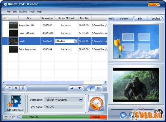 Xilisoft DVD Creator - программа для создания и записи (прожига) DVD с простым и удобным русским интерфейсом. Основные возможности, это - создание DVD с полноценными меню и субтитрами из AVI, MPEG, WMV, DV, DivX, Xvid, VOB, 3GP, 3G2, MP4 и других видеофайлов; выбор из имеющихся преднастроек или собственная настройка параметров видео - битрейда, фреймрейда, качества и других параметров DVD, поддержка NTSC и PAL, поддержка соотношений картинки 4:3 и 16:9, предварительный просмотр результата, наконец, прожиг созданного проекта на DVD. Возможно создание и запись на DVD ISО-образа. Поддерживаются DVD-R, DVD+R, DVD-RW, DVD+RW.